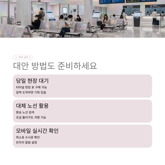 또한 예매 실패 시, 현장 발권도 가능한 노선이 있으며, 모바일 예매와 연동되어 QR 탑승권으로도 발권할 수 있습니다. 상황에 따라 ‘당일 대기석’ 이용도 고려해보세요.